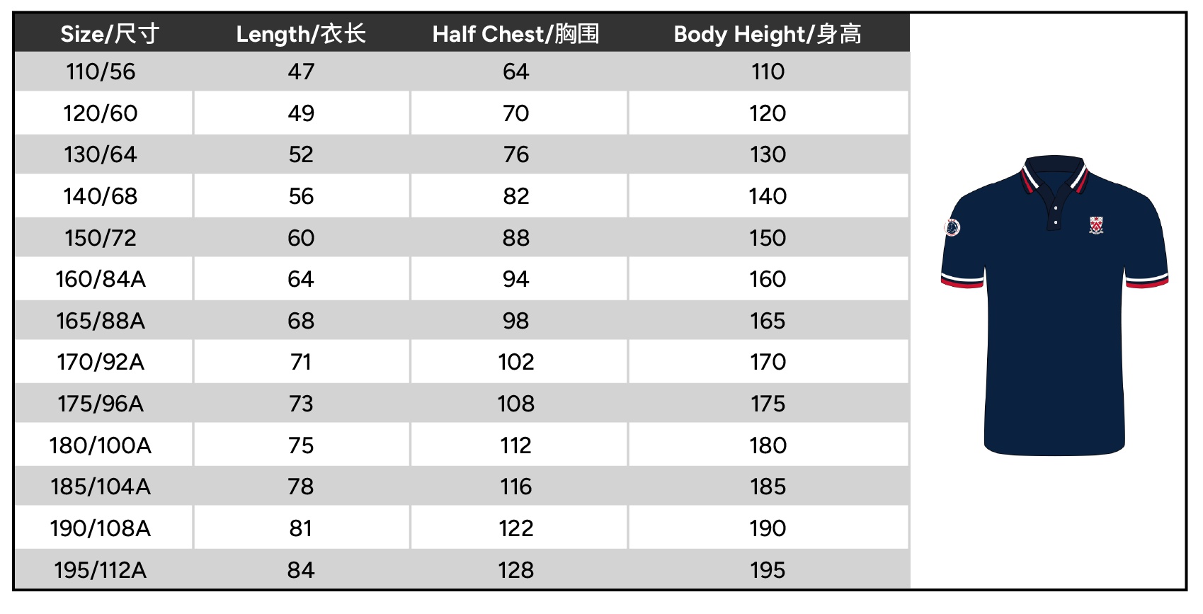 Size 110 or 120 or 130 or 140 or 150 or 160 or 165 or 170 or 175 or 180 or 185 or 190 or 195